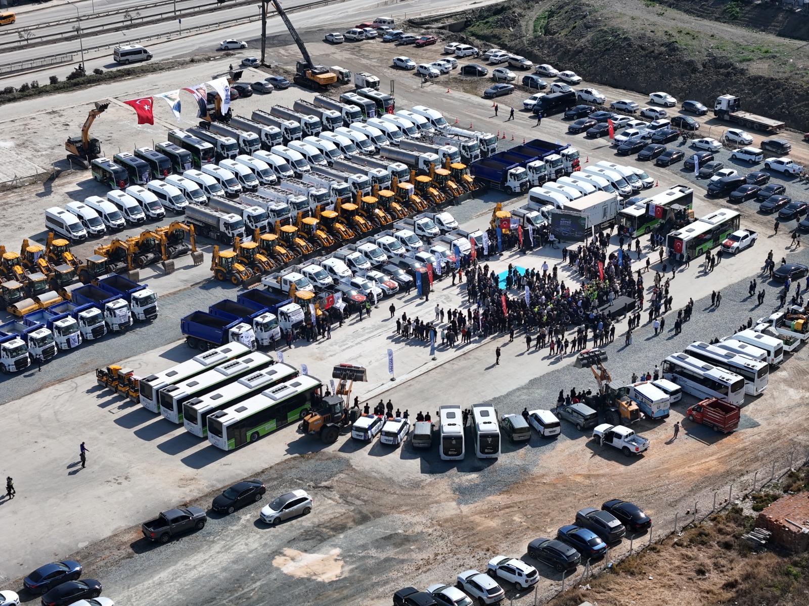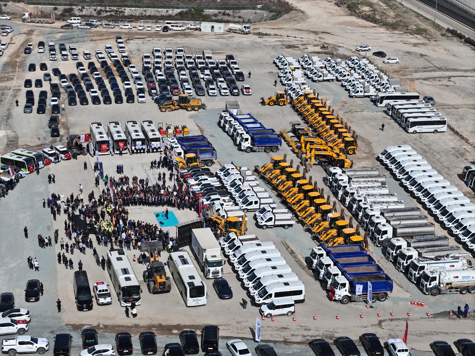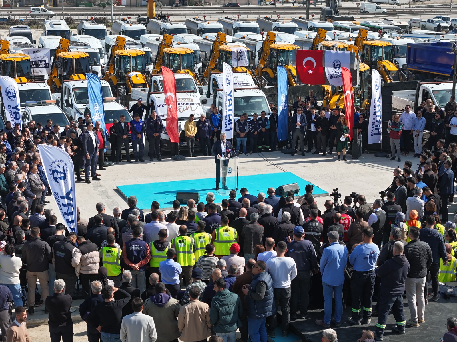 İsrafın önüne geçerek gereksiz harcamaları engellediklerini, şeffaf ve dürüst bir anlayışlar kaynakları verimli kullanarak 5 milyar TL’ye yakın borç öderken Hatay’ı da yeniden ayağa kaldırmak amacıyla gece gündüz çalıştıklarını kaydeden Başkan Öntürk, “İşte bugün, bu çalışmalarımızın en somut meyvesini, gururla sunuyorum: Hatay Büyükşehir Belediyesi’nin 1000 yeni hizmet aracı işte burada!” diyerek müjdesini paylaştı.