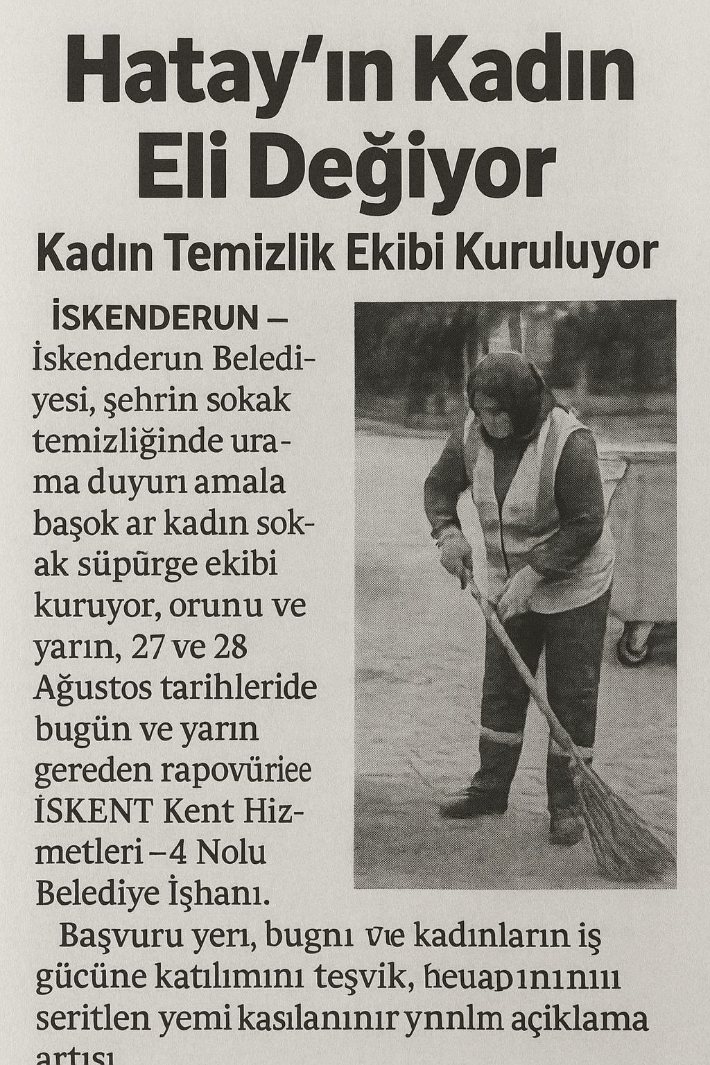 İskenderun Belediyesi, 27 Ağustos 2025 tarihi itibarıyla şehirde önemli bir sosyal dönüşüm projesine imza atarak temizlik hizmetlerinde kadınların daha aktif rol almasını sağlayacak bir adım attı. “Hatay’ın Kadın Eli Değiyor”..